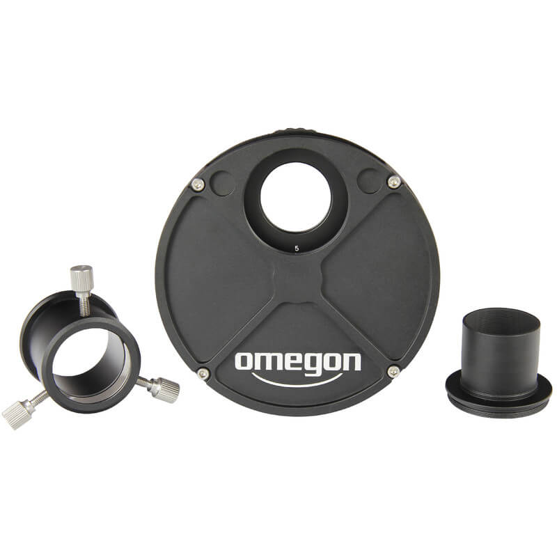 Lehké 5-poziční manuální filtrové kolo pro 1,25” filtry, 254 g. Optická délka 22 mm. Na vstupu 1,25” tubusek a T2 závit, na výstupu taky 1,25” a T2 závit.